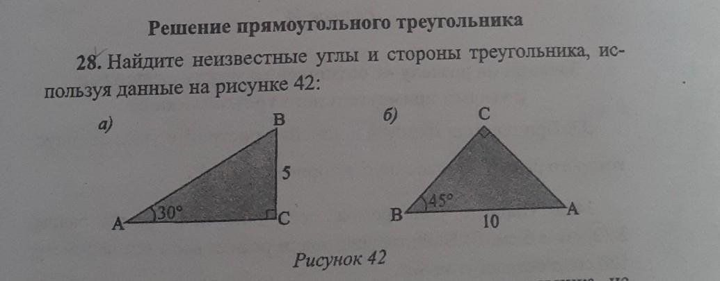 Найдите неизвестные углы и стороны треугольника используя данные на рисунке 42