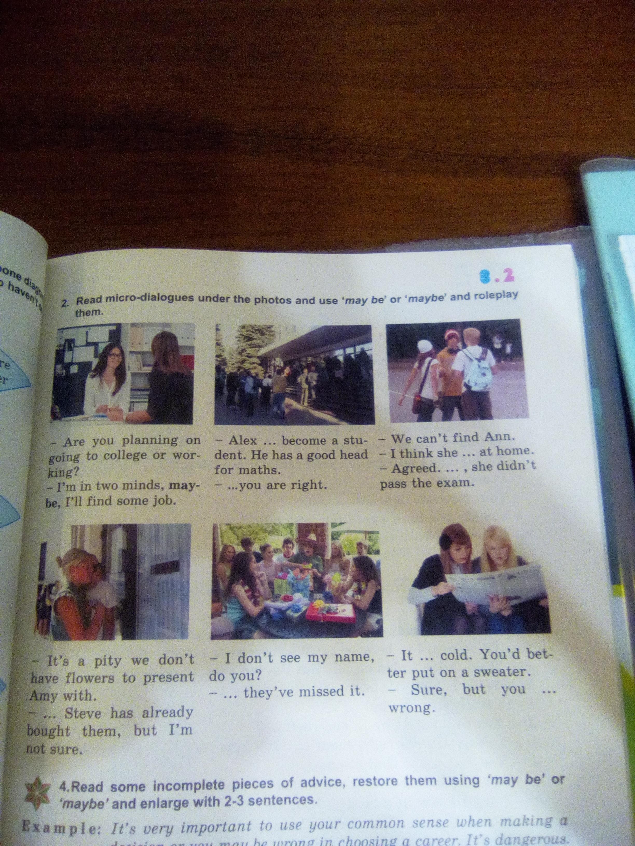 Помогите! Прочитать диалоги вставить в пропуски maybe или may be!!!!!! Срочно, помогите, прошу........................ И напишите перевод этих диалогов!!! Прошу..........