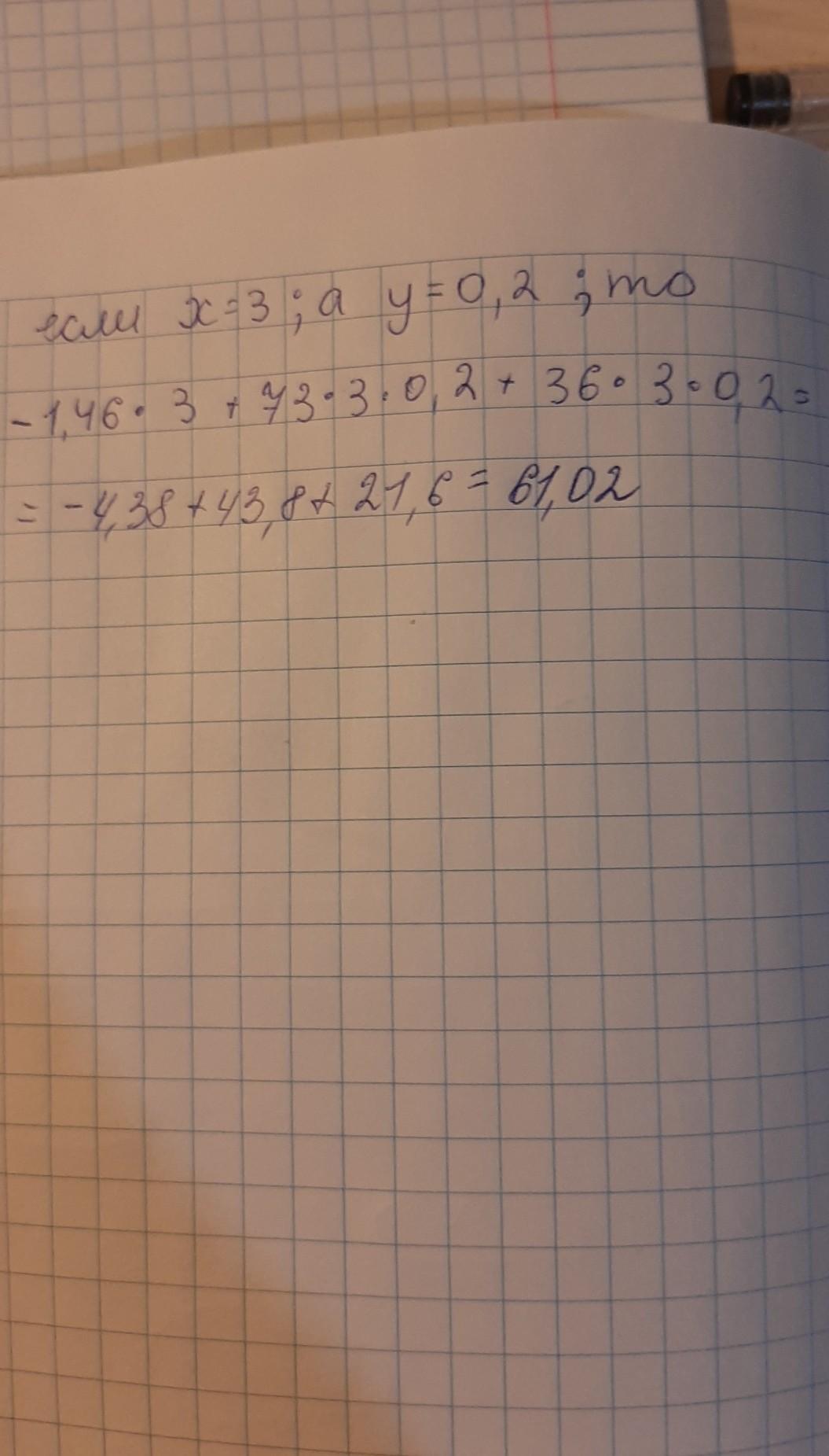 Найди значение многочлена –1,46х + 73xy2 + 36xy2, если х = 3 и y = 0,2.