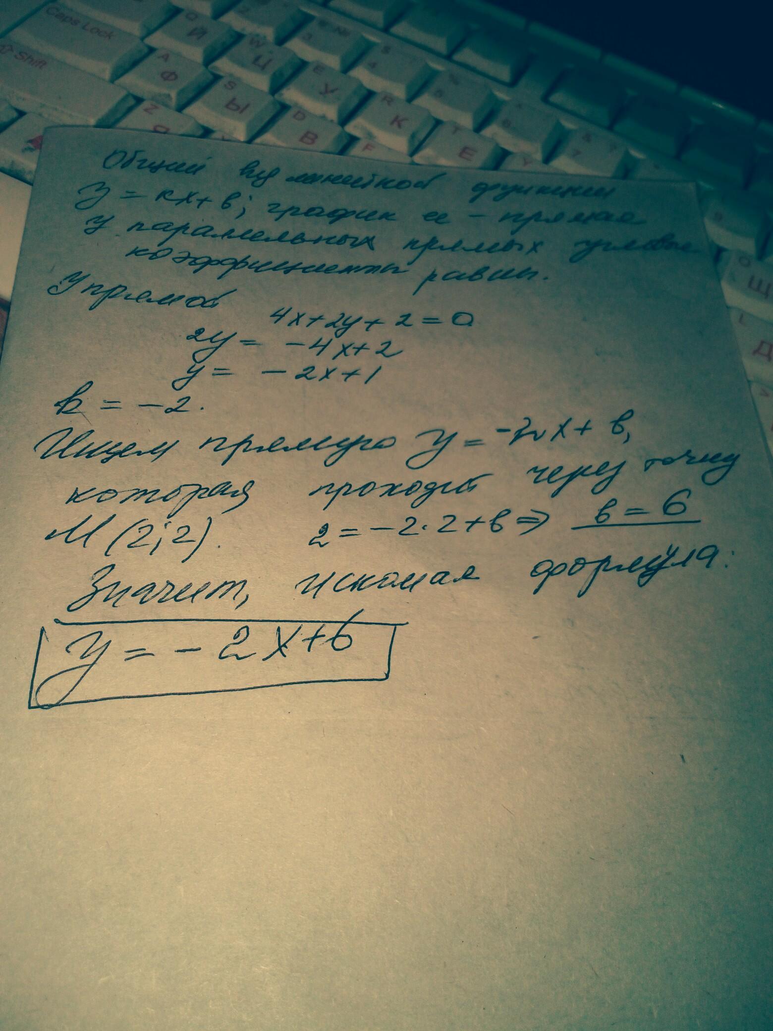 Вырази линейную функцию, график которой параллелен графику линейной функции 4x+2y+2=0 и проходит через точку M(2;2), через формулу.