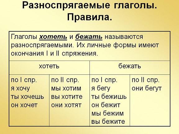 Разноспрягаемые глаголы – это глаголы ХОТЕТЬ, БЕЖАТЬ и производные от них ХОТЕТЬСЯ, ЗАХОТЕТЬ и пр.; СБЕЖАТЬ, СБЕЖАТЬСЯ, УБЕЖАТЬ, ПОДБЕЖАТЬ, ВБЕЖАТЬ и пр.