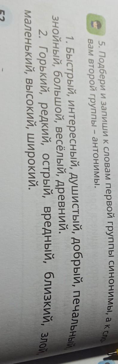 пятое задание подбери и запиши к словам первую группы Синонимы к словам второй группы антонимы 1 быстрый интересный душистый добрый печальный знойный большой весёлый древний 2 горькие редкие острый вредные близкий злой маленький высокий широкий