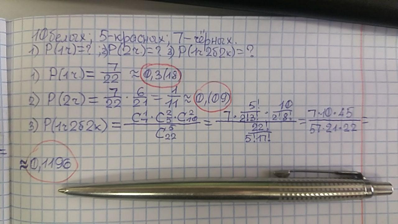 1. вероятность считается исходя из 7 чёрных (всего их в наборе столько) и 22 всех цветов (10+5+7=22).