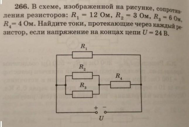 Даю 50 баллов. В схеме, изображенной на рисунке, сопротивления резисторов: R=12 ом, R=3 ом, R=6 ом, R=4 ом. Найдите токи, протекающие через каждый резистор, если напряжение на концах цепи U=24 В.