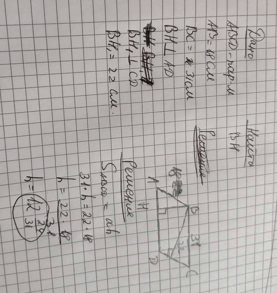 Стороны параллелограмма 31см и 18см. Высота проведенная к меньшей стороне равна 22 см. Найти высоту проведенную к большей стороне.