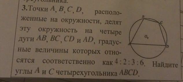 Точки A,B,C,D, расположенные на окружности, делят эту окружность на четыре дуги AB,BC,CD и AD, градусные величины которых относятся соответственно как 4:2:3:6. найдите углы A и C четырёхугольника ABCD
