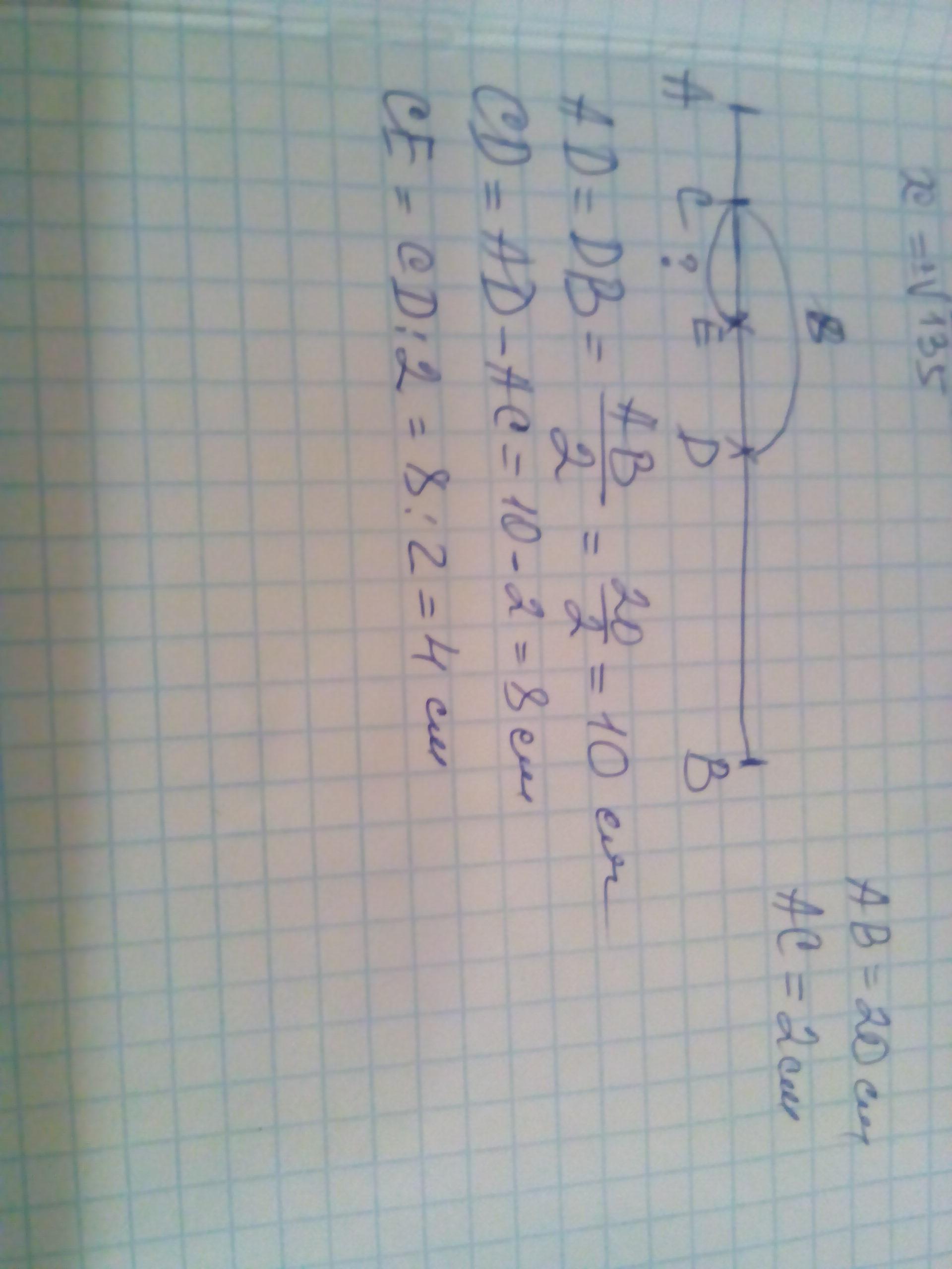 На відрізку АВ довжиною 20 см позначено точки С, D, E так, що АС =2см, AD=DB і СЕ=ED. Чому дорівнює довжина відрізка ED?