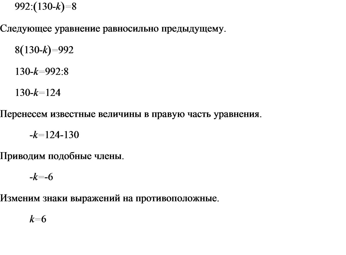 992:(130-к)=8, 130-к=992:8, 130-к=124, 130-124=к, к=6. проверка: 992:(130-6)=8, 992:124=8, 8=8.