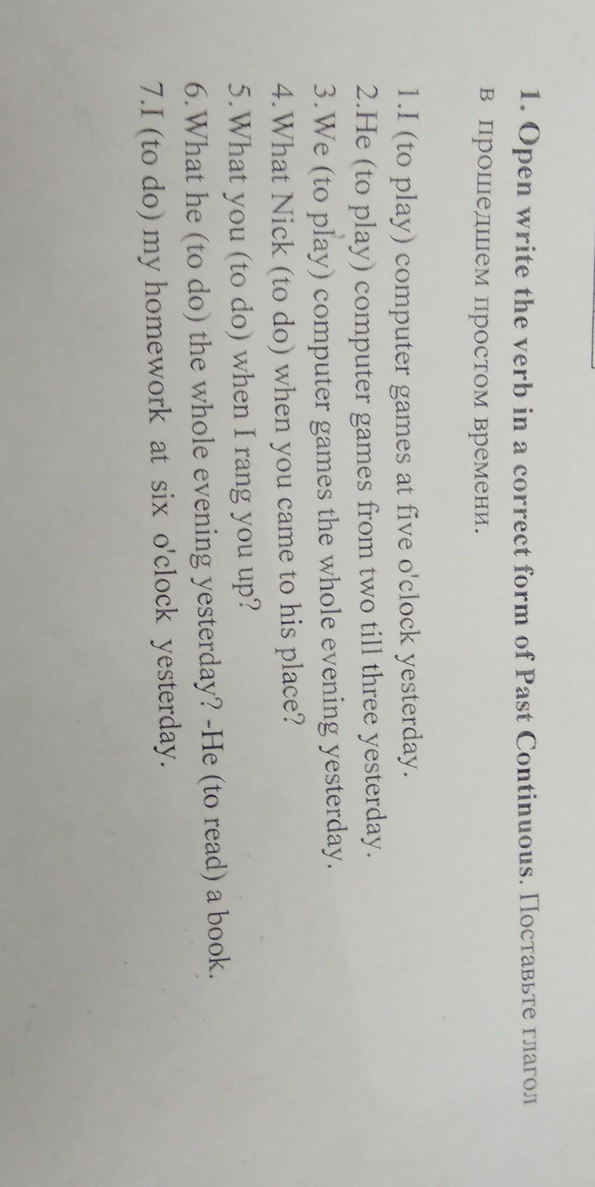 1. Открой, напиши глагол в правильной форме Прошлого. ЛоктаЛе Раара Бипуе, ме нпоКром Бпеменн. 1.1 (играть) в компьютерные игры вчера в пять часов. 2. Вчера он играл в компьютерные игры с двух до трех. 3. Вчера мы весь вечер играли в компьютерные игры. 4. Что Ник (делать), когда вы пришли к нему домой? 5. Что ты (делать), когда я позвонил тебе? 6 Что он (чтобы сделать) весь вечер вчера? -Он (читать) книгу. 7.1 (сделать) мою домашнюю работу вчера в шесть часов.