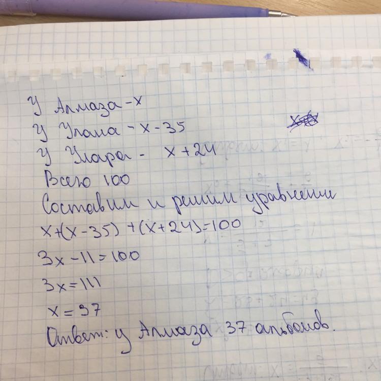 На вопрос о том, сколько у них альбомов, Алмаз ответил,что у него на 35 больше, чем у Улана, и на 24 меньше, чем у Улара, а всего у них всех 100 альбомов. Сколько альбомов у Алмаза