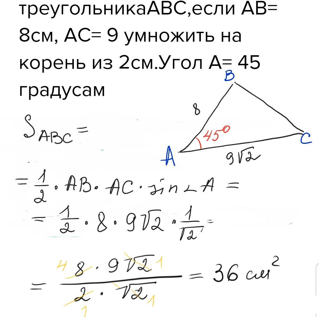 СРОЧНО!!! Найдите площадь треугольникаABC,если AB= 8см, AC= 9 умножить на корень из 2см.Угол A= 45 градусам