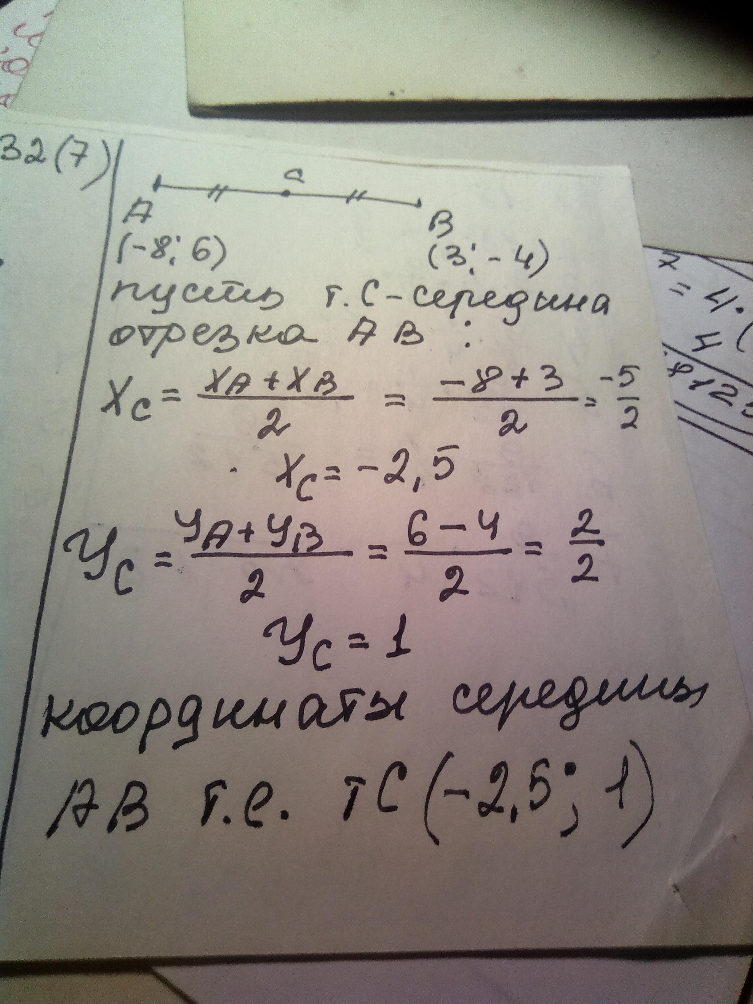 дан отрезок ав. точки концов отрезка имеют координаты a(-8;6), b(3;-4). найдите координаты середины отрезка AB