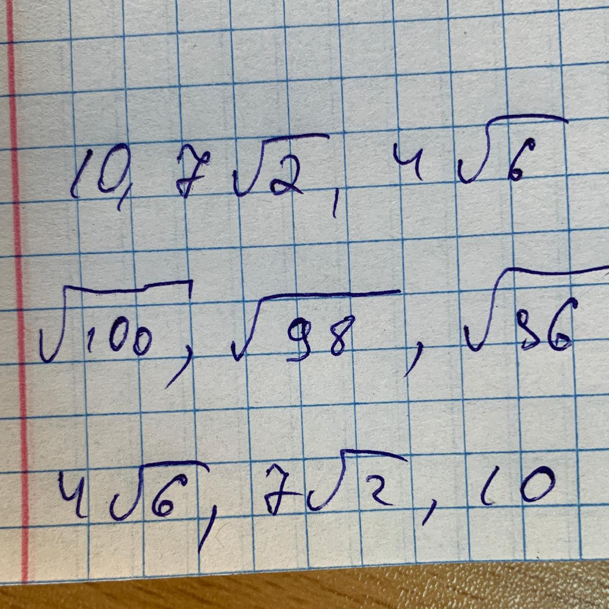Расположиье в порядке возрастания числа 10, 7 корень из 2, 4 корень из 6.