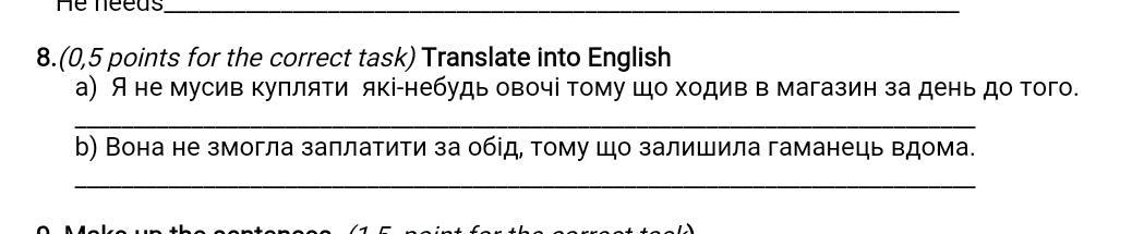 I should not have bought any vegetables because I went to the store the day before. She could not pay for lunch, because she left her wallet at home.