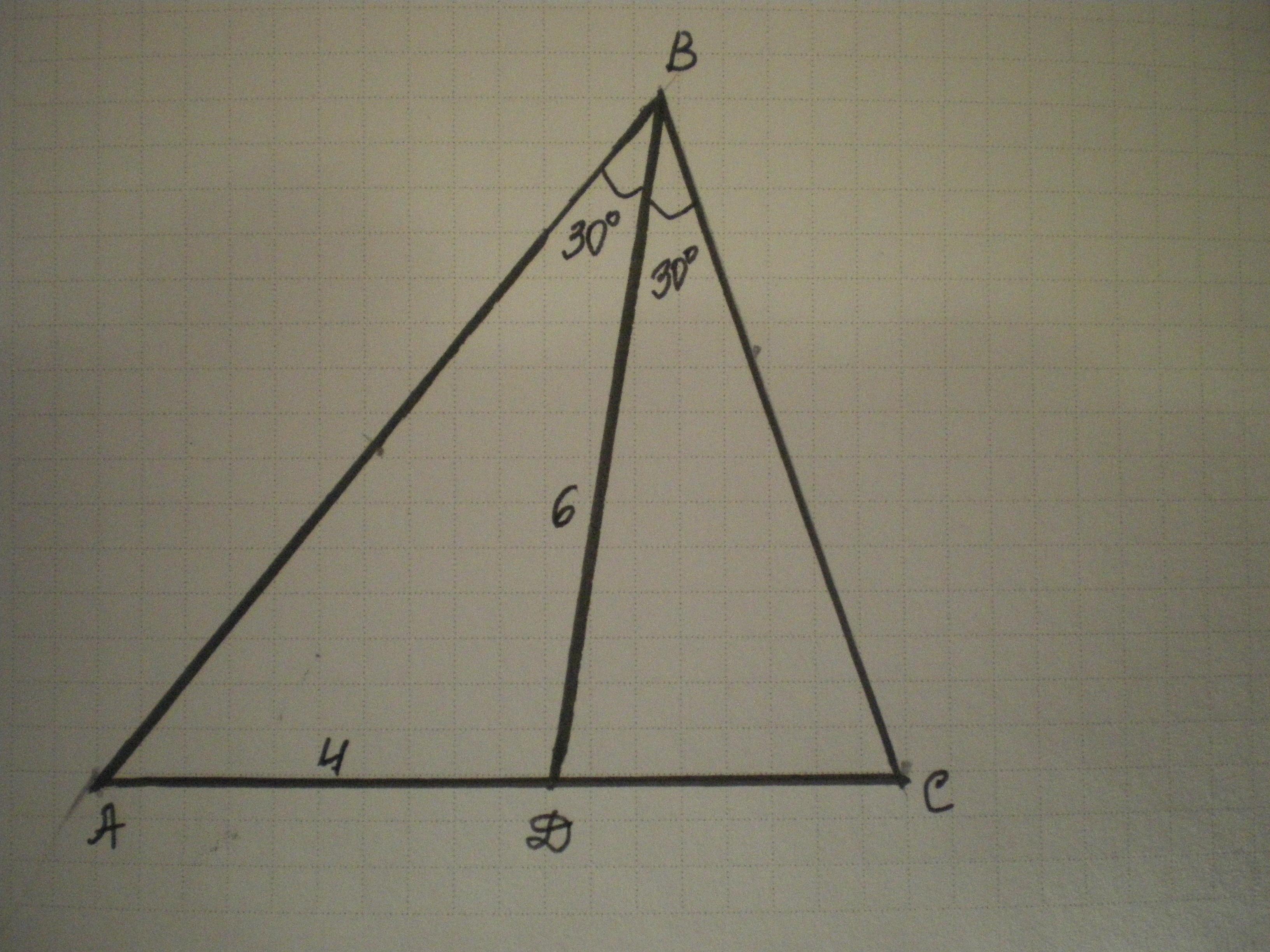 В ТРЕУГОЛЬНИКЕ ABC УГОЛ B РАВЕН 60. БИССЕКТРИСА УГЛА B ПЕРЕСЕКАЕТ СТОРОНУ AC В ТОЧКЕ D, AD =4 СМ, BD= 6СМ. НАЙДИТЕ УГЛЫ ТРЕУГОЛЬНИКА ABC И ЕГО СТОРОНУ AC