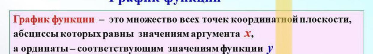 График функции — понятие в математике, которое даёт представление о геометрическом образе функции. Наиболее наглядны графики вещественнозначных функций вещественного переменного. В этом случае, график функции — это геометрическое место точек плоскости, абсциссы (x) и ординаты которых связаны указанной функцией