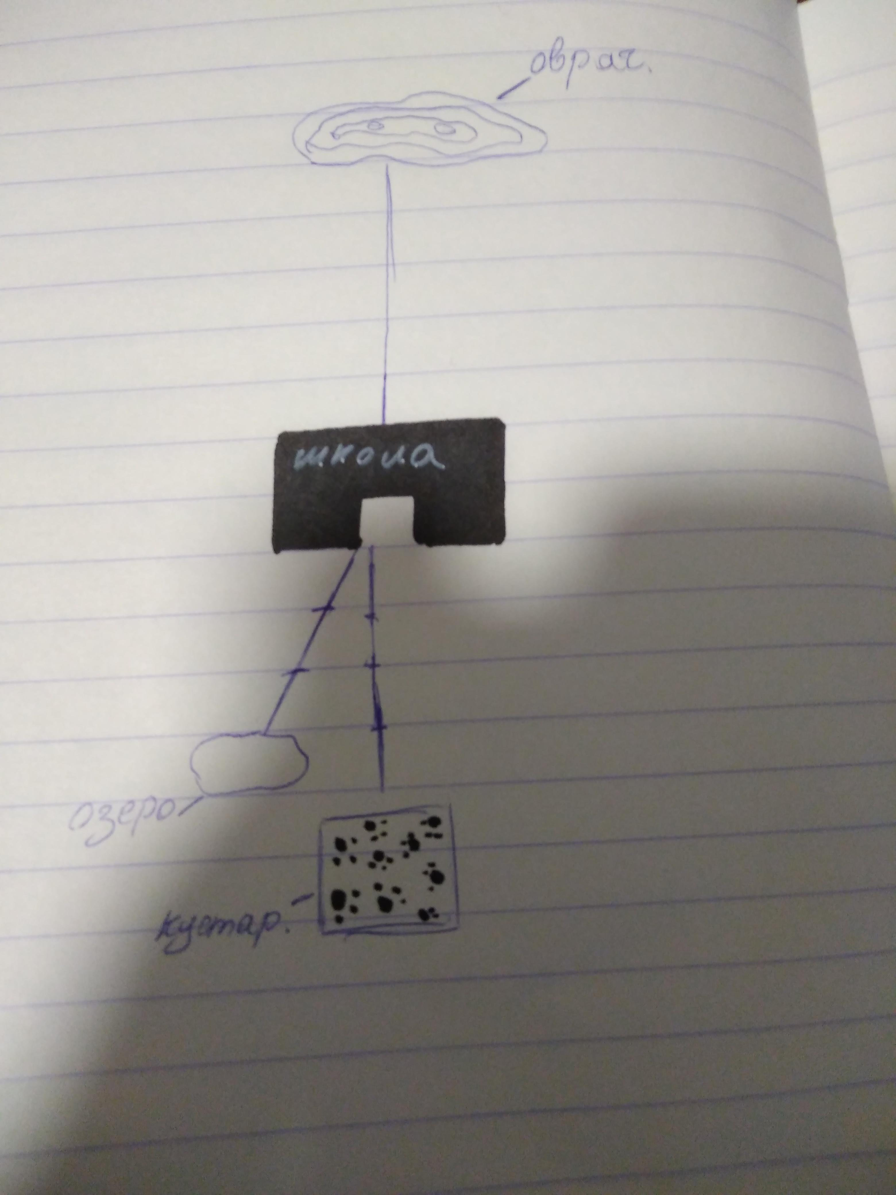 Составьте план местности в масштабе в 1см100м.В центре страницы в тетради условным знаком обозначьте школу . На расстоянии 500 м от школы в направлении на север - овраг, в 300 м на юго- запад- озеро,в 400 м на юг - кустарник