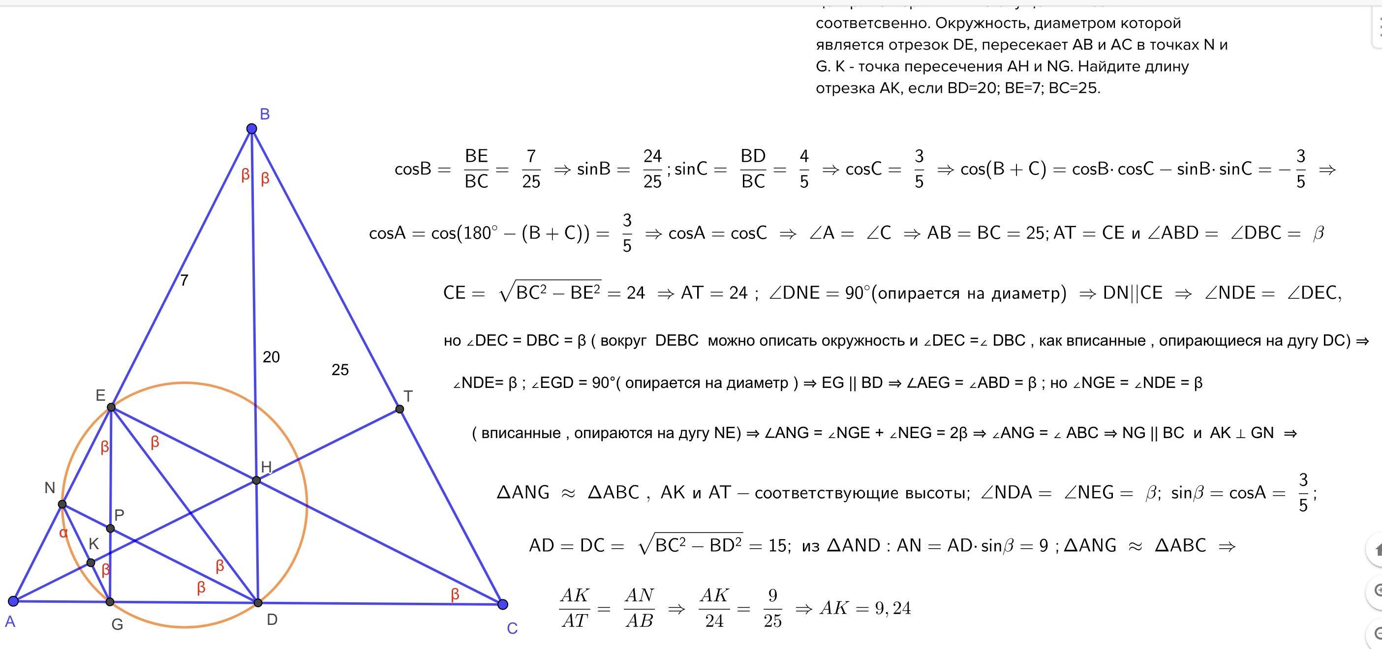 Дан остроугольный треугольник ABC, где H - орто центр. Из вершин B и C опущены высоты D и E соответсвенно. Окружность, диаметром которой является отрезок DE, пересекает AB и AC в точках N и G. K - точка пересечения AH и NG. Найдите длину отрезка AK, если BD=20; BE=7; BC=25.