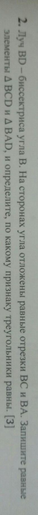 Луч BD - биссектриса угла B. На сторонах угла отложены равные отрезки BC и BA. Запишите равные элементы BCD и BAD, и определите, по какому признаку треугольники равны