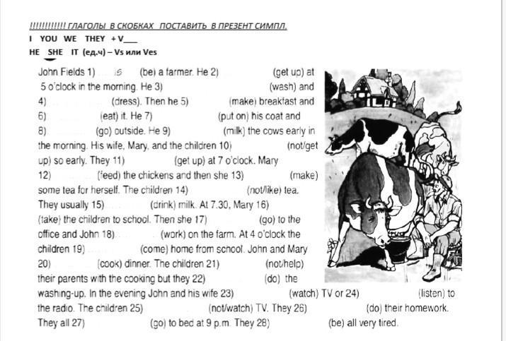 1) İs. 2) Gets up .3)Washes. 4) Dresses 5)Makes.6) Eats.7) Puts 8)Goes.9) Milks.10) Doesn't get.11) Get up.12) Feeds.13) Makes.14)Don't like.15)Drink.16) Takes.17) Goes.18) Works.19) Come.20) Cook.21) Don't help.22) Do.23) Watches.24) Listens.25) Don't watch .26) Do.27) Go.28) Are.