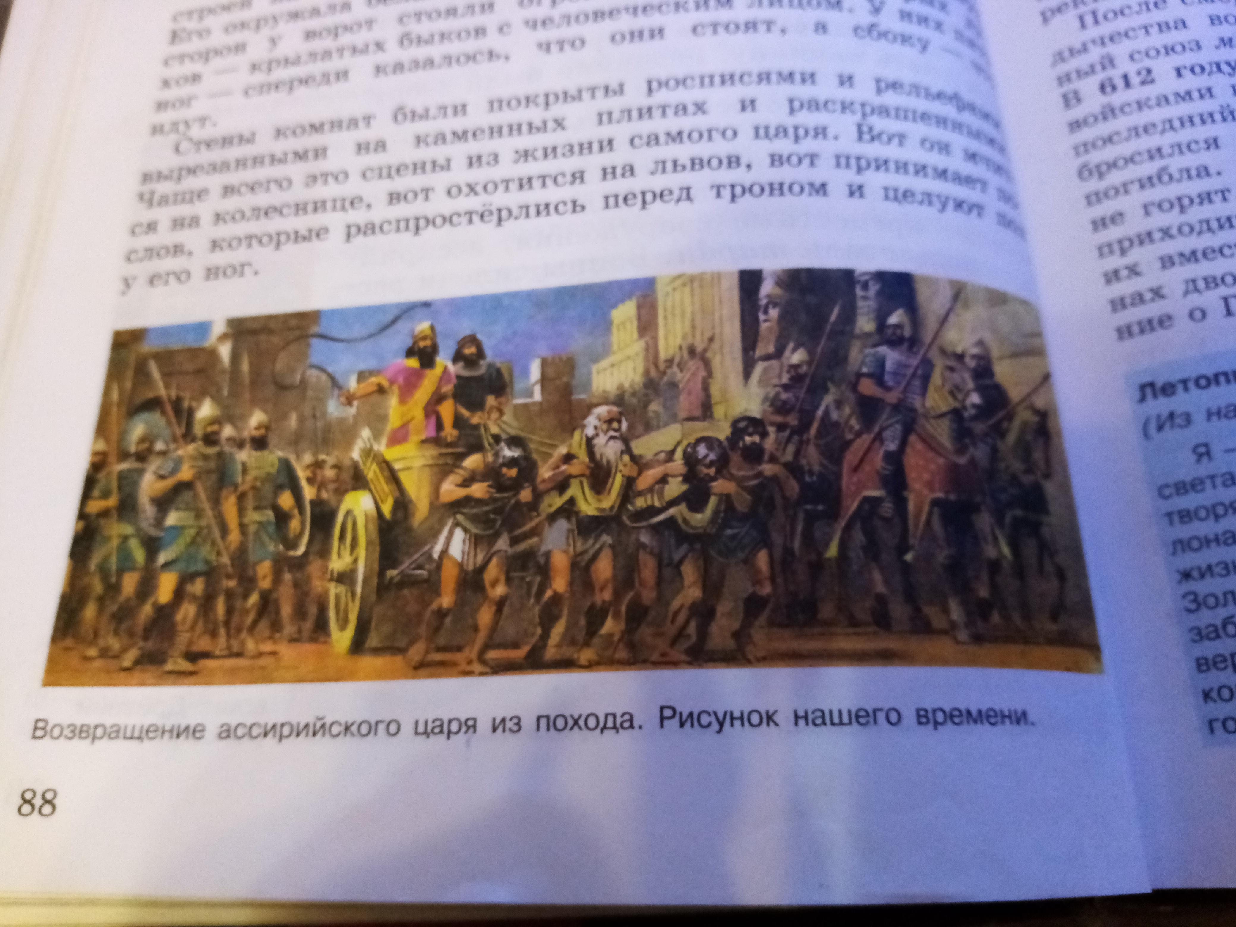 Опишите по рисунку нашего времени возвращение ассирийского войска в Ниневию по плану 1)царская колесница 2)унижение пленных царей 3)воины-победители 4)каменные стражи при входе во дворец.