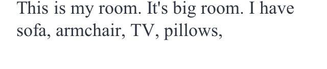 This is my room. It's big room. I have sofa, armchair, TV, pillows,