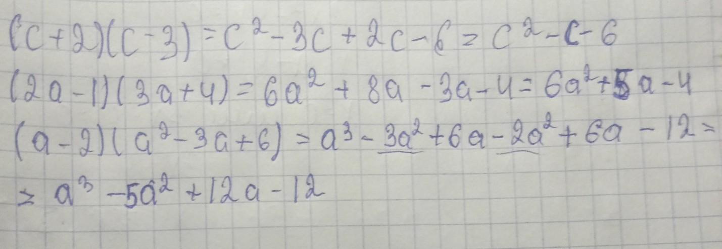 выполните умножение: а) (c+2)(c-3); б) (2a-1)(3a+4); в) (a-2)(a^2-3a+6) помогите кто помнит как решать