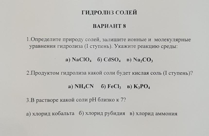 а) NaCIO₄ хлорат натрия. Соль образована сильным основанием NaOH и сильной кислотой HCIO₄. Такие соли гидролизу не подлежат, они в воде растворяются. Реакция среды таких растворов нейтральна. рН = 7