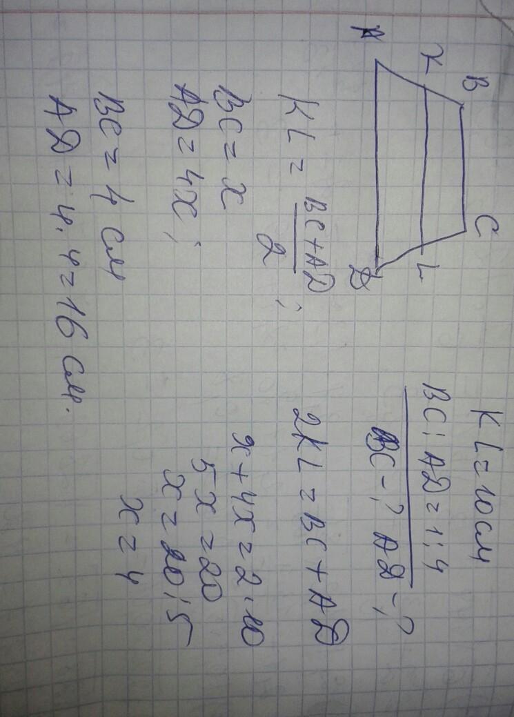 Середня лінія трапеції 10 см , а основи відносяться як 1:4 . Знайти основи трапеції