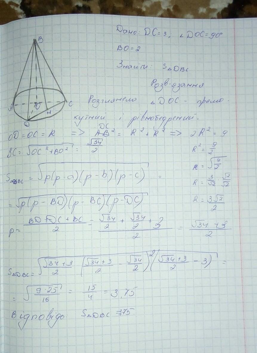 Хорда основи конуса дорівнює 3 см і стягує дугу 90°