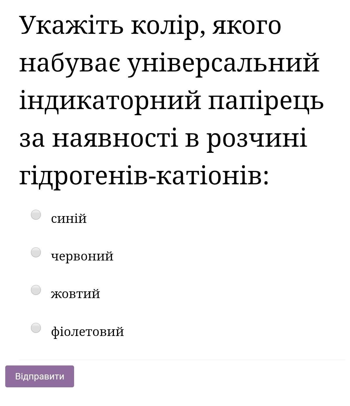 Наявність катіонів Гідрогену у розчинах визначають за зміною забарвлення індикаторів. Оскільки спільними в складі кислот є йони Гідрогену, то вони зумовлюють кисле середовище їх розчинів й, відповідно, однаково діють на індикатори
