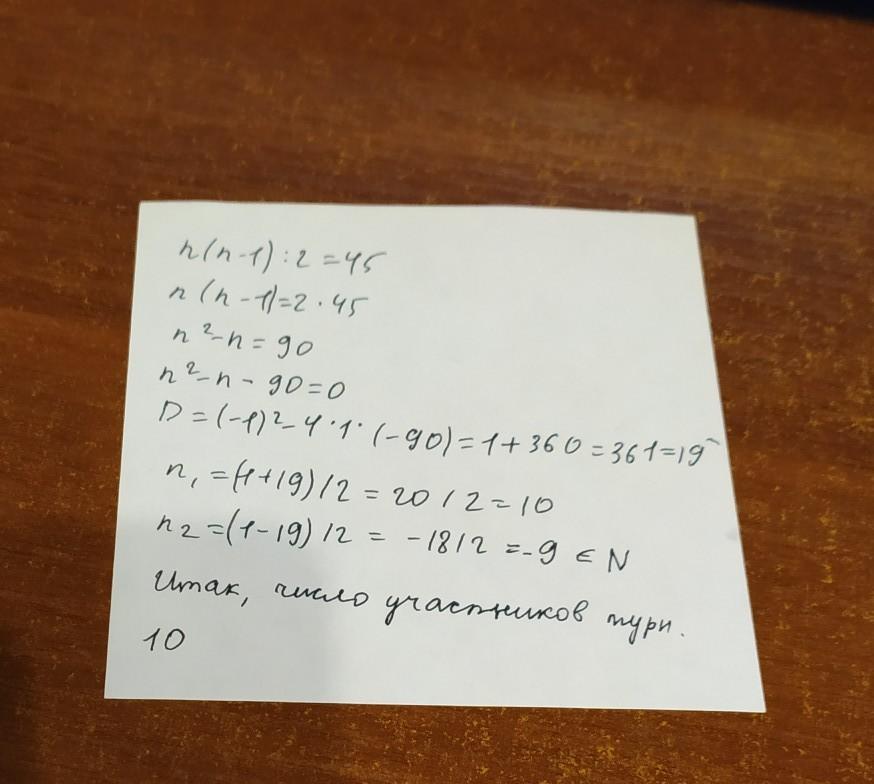 Сколько человек участвовало в шахматном турнире ,если известно что каждый участник сыграл с каждым из остальных по одной партии, и всего было сыграно 45 партий?плизз решение