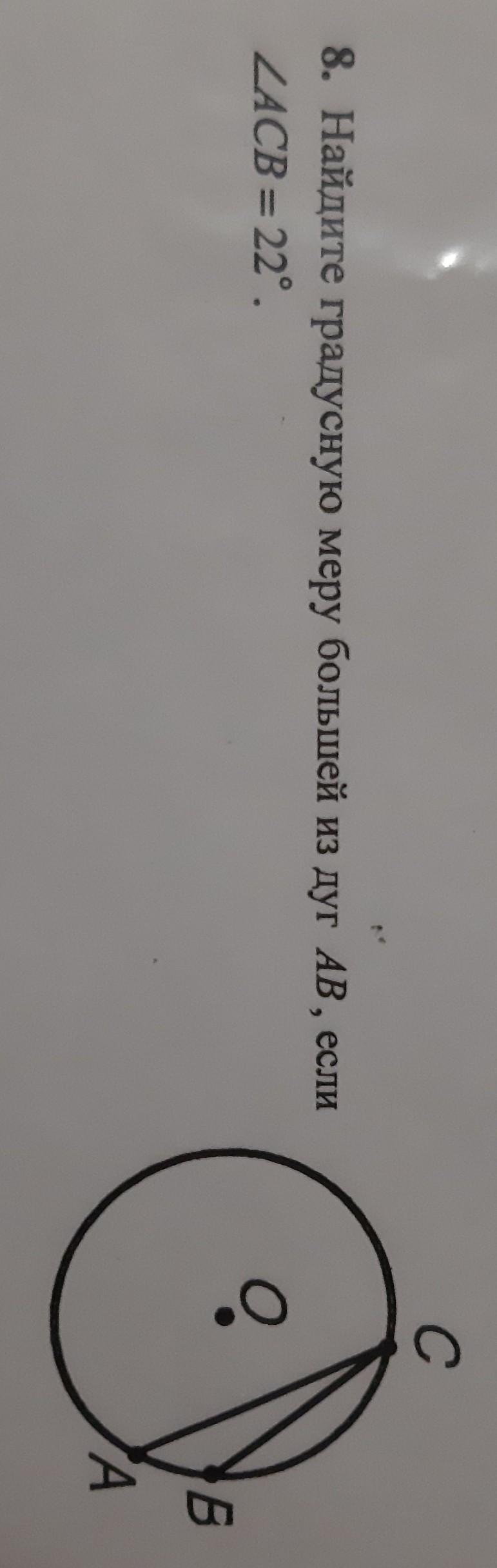 Пошаговое объяснение: угол ACB вптсанный, значит меньшая дуга АВ равна 2*угол АСВ, меньшая дуга АВ=2×22=44. Вся дуга равна 360, значит , большая дуга АВ равна 360-44=316