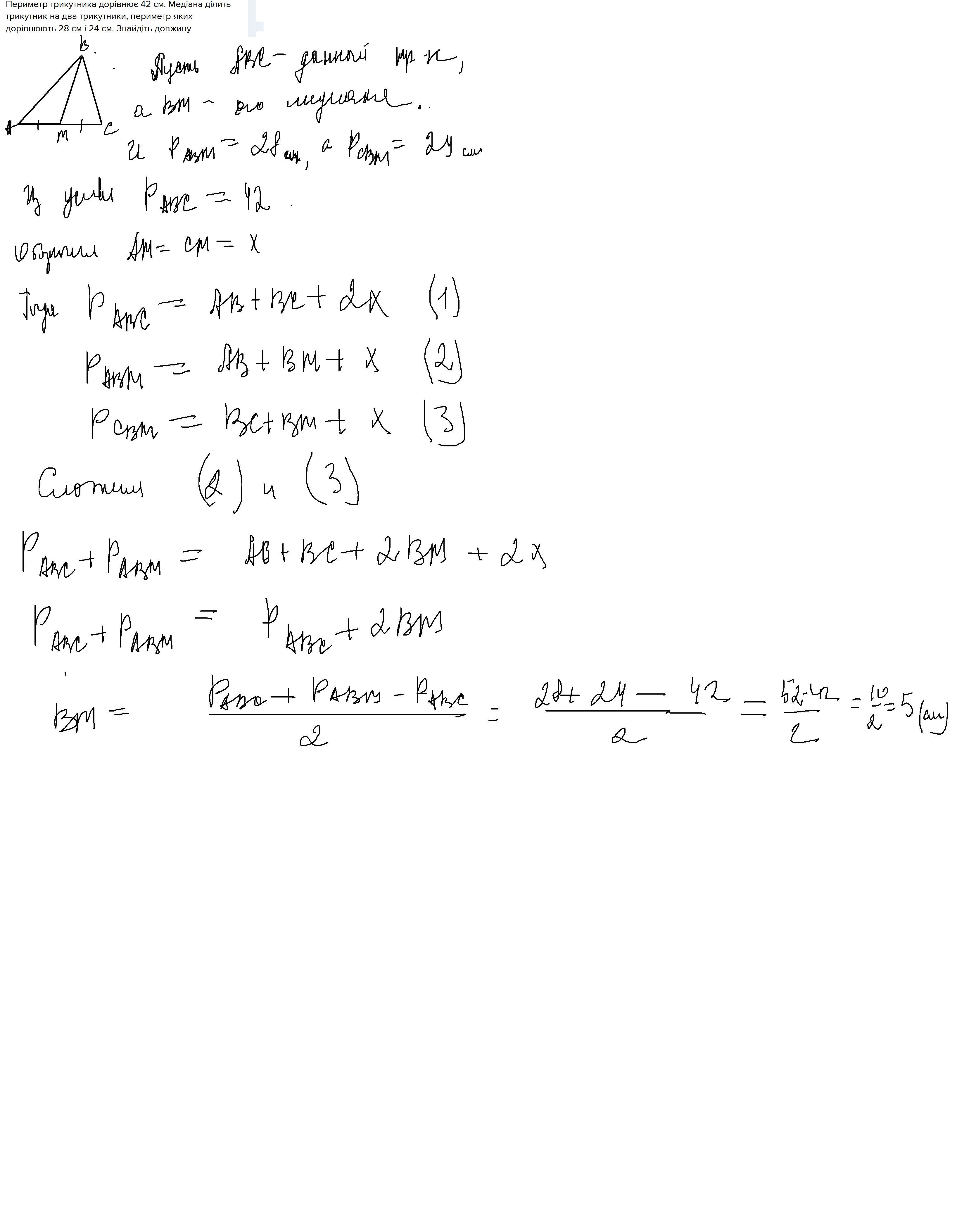 Периметр трикутника дорівнює 42 см. Медіана ділить трикутник на два трикутники, периметр яких дорівнюють 28 см і 24 см. Знайдіть довжину медіани.Но как понять ответ?