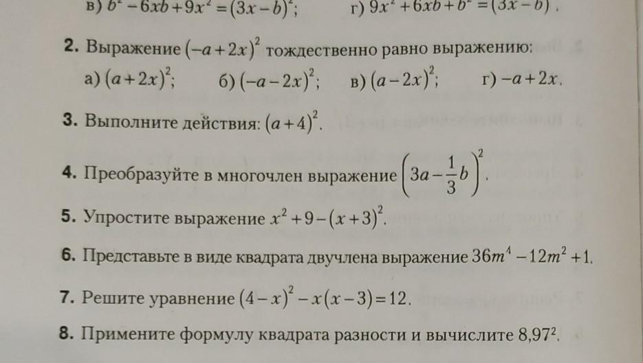 4. (3а-1/3*б)^2=(3а)^2-2*3а*1/3*б+(1/3*б)^2=9а^2-2аб+1/9*б^2