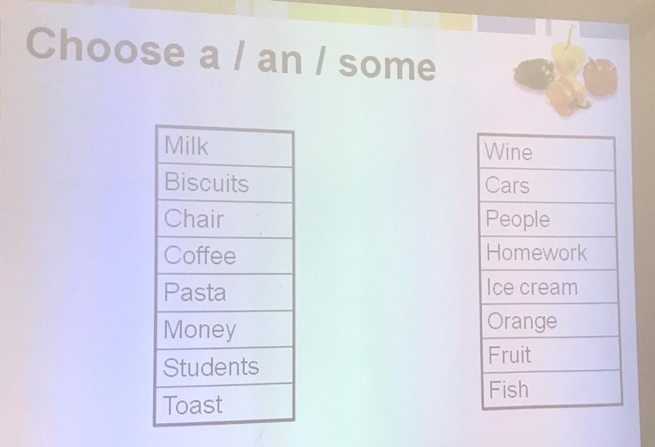 choose a/an/some milk, biscuits, chair, coffee, pasta, money, students, toast, wine, cars, people, homework, ice cream, orange, fruit, fish