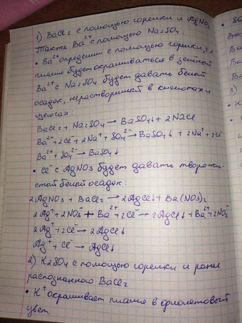 Как при помощи нитрата серебра, сульфата натрия и пламени горелки определить, какое из веществ – хлорид бария, сульфат калия, хлорид калия – представляет собой исследуемый образец? Ответ мотивировать и подтвердить уравнениями всех возможных реакций в молекулярной и молекулярно-ионной форме.