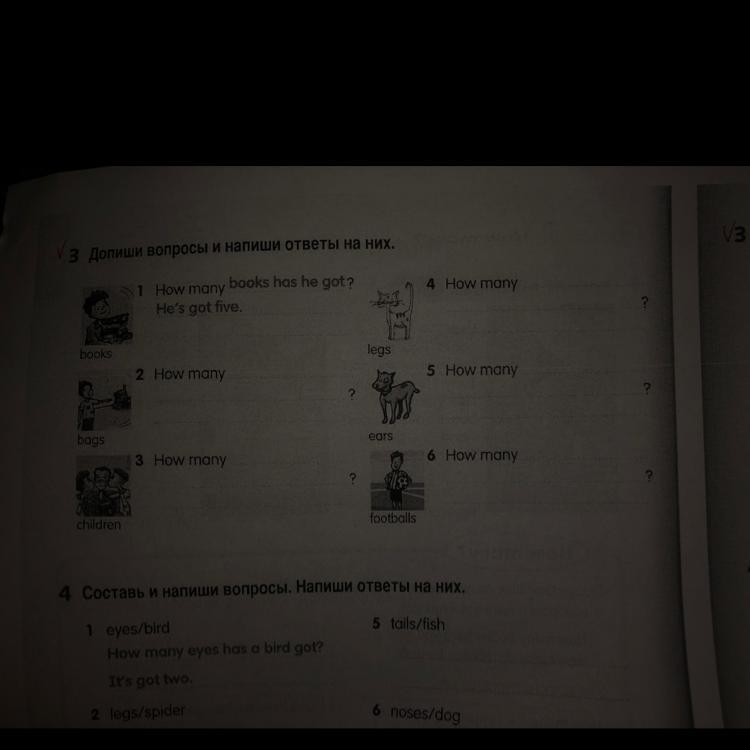 Ответ:bags has he got?He's got one bag.3. children has he got? He's got two children. 4. legs has it got. It's got four legs.5.ears has it got? It's got two ears. 6.