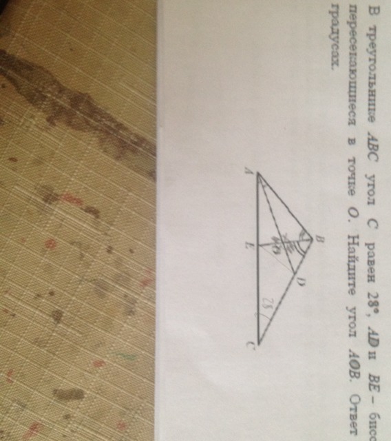 В треугольнике АВС угол с равен 28* AD и ВЕ бисектрисы пересекающиеся в точке О. Найдите угол АОВ. Ответ дайте в градусах