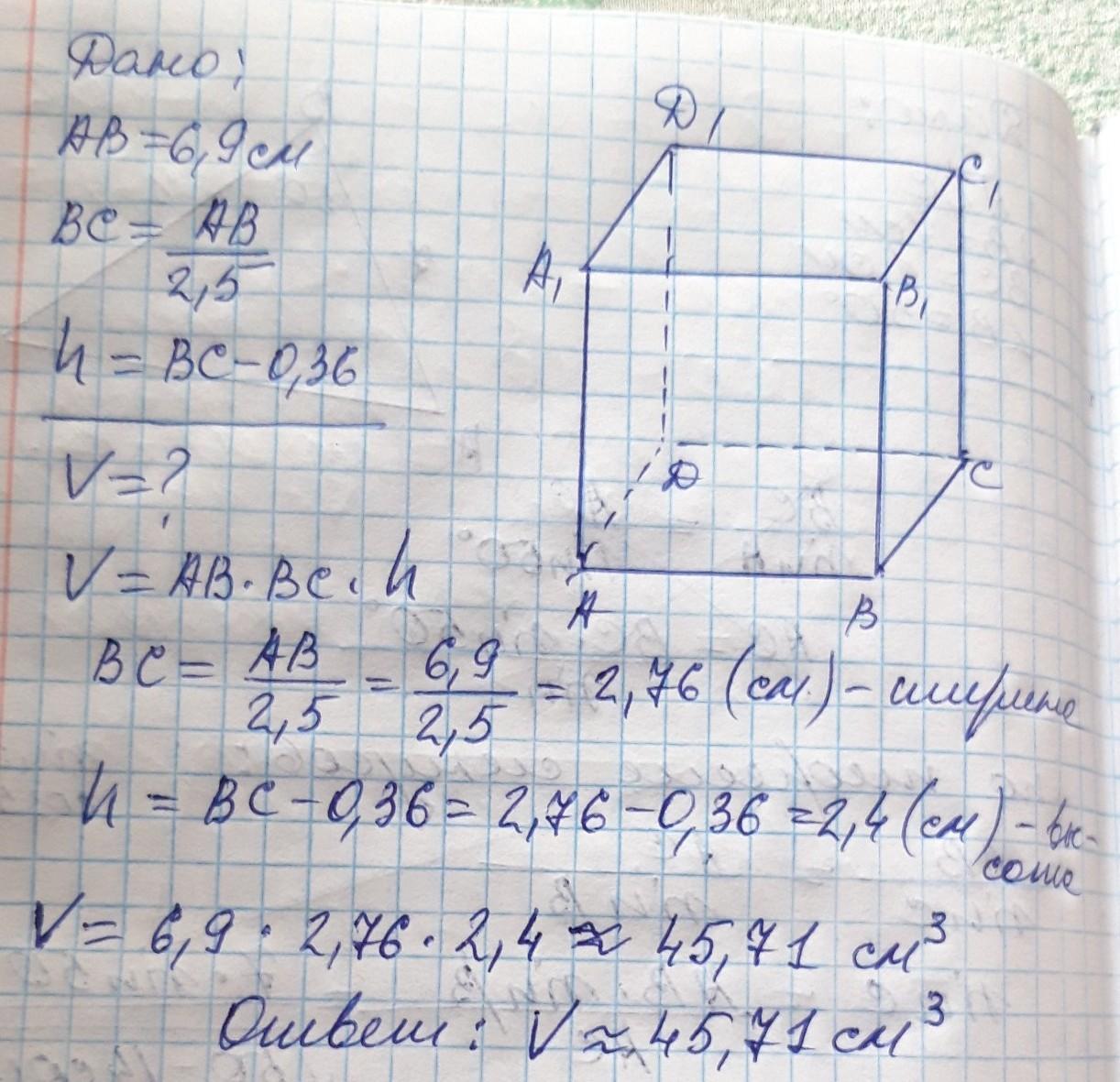 Найдите объем прямоугольного параллелепипеда если его длина равна 6,9 см ширина в 2,5 раза меньше длины а высота на 0,36 см меньше ширины