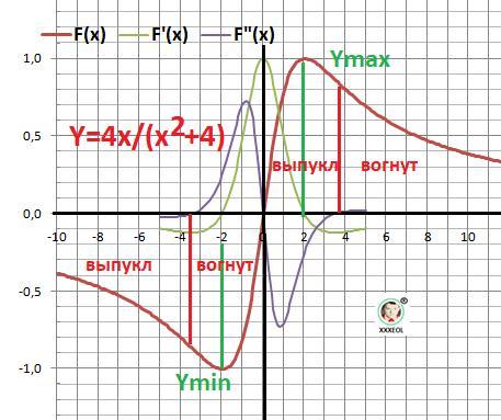 Точки перегиба: при х1 = -2√3 (≈-3,5), х2= 0, х3 = 2√3 (≈3,5) 11. Вогнутая - "ложка"- X∈(-2√3;0)∪(2√3;+∞),