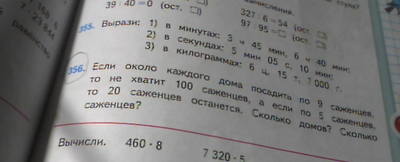Если без уравнения то: Итак, предположим что за каждым домиков в начале числится 9 саженцев, а потом 5 саженцев, выходит, что от каждого домика мы забрали по 4 деревца. И вышло так, что получившемся числом саженцев, которые мы отняли, можно занять те домики за которыми саженцы числятся, но которые возле себя саженцев не имеют (вспомним, что не хватило 100 саженцев), а еще и останется 20. То есть мы,отняли от домиков всего 120 деревьев, от каждого домика по 4 дерева, получается : 120/4=30 домиков Мы знаем, что если дать 30 домикам 5 деревьев, то останется 20. 30*5=150 саженцев у домиков 150+20=170 саженцев всего Ответ: 170 саженцев и 30 домов