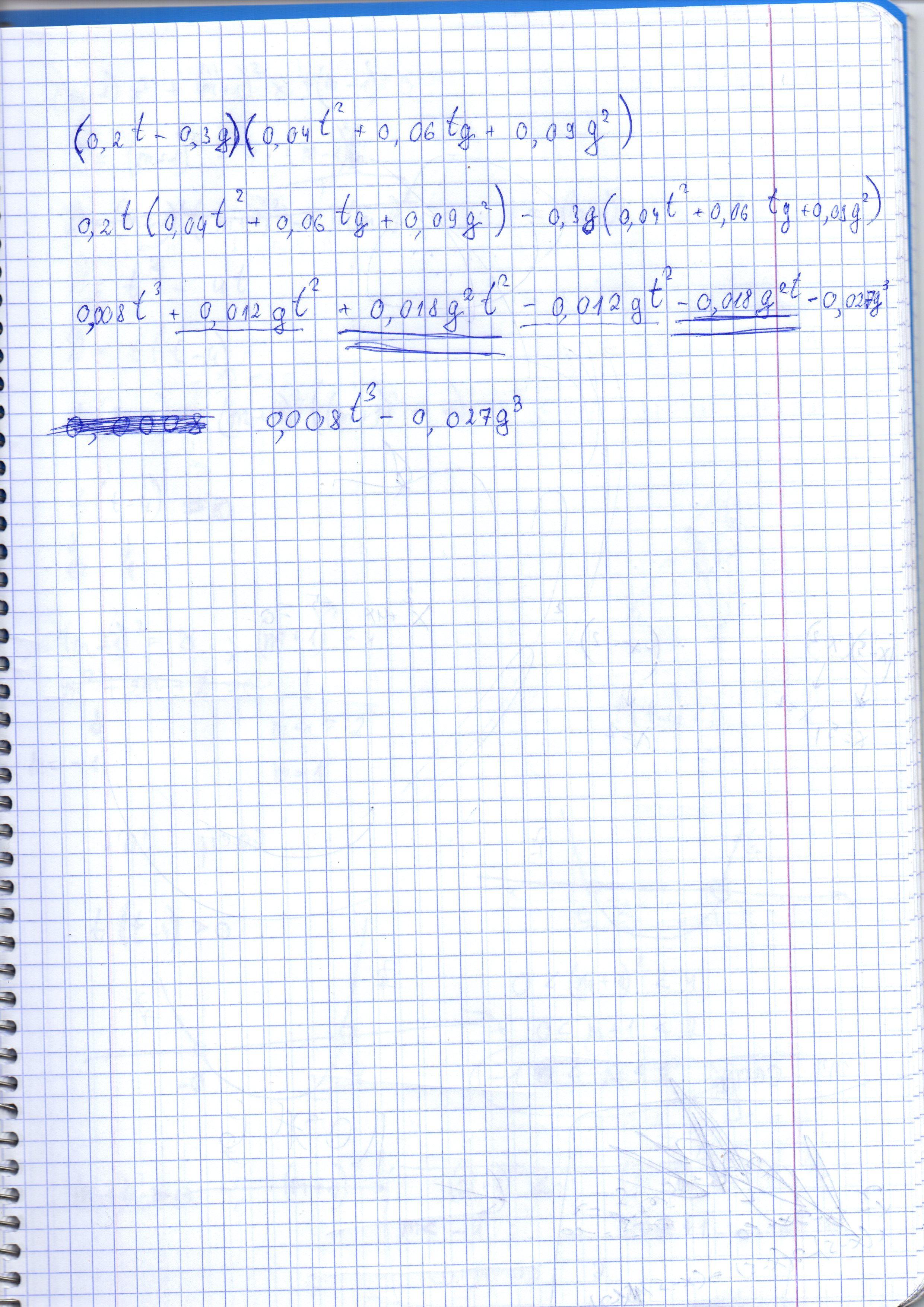 Выполни умножение многочленов: (0,2t−0,3g)(0,04^t2+0,06tg+0,09g^2) .