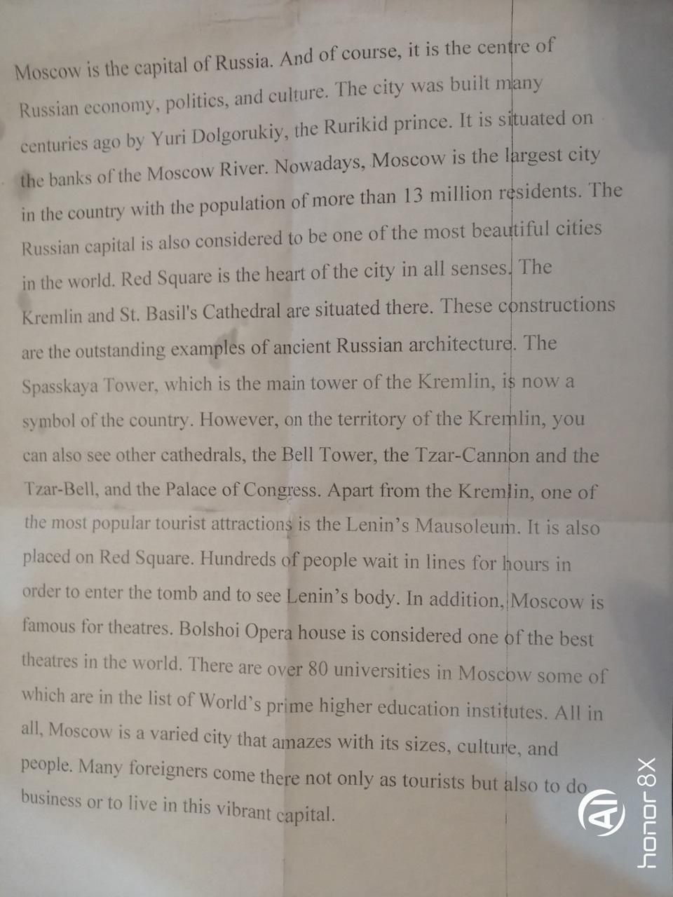 Москва столица России. И, конечно же, это центр российской экономики, политики и культуры. Город был построен много веков назад князем Юрием Долгоруким. Он расположен на берегу реки Москвы. В настоящее время Москва является крупнейшим городом страны с населением более 13 миллионов жителей. Российская столица также считается одной из самых красивых городов мира. Красная площадь является сердцем города во всех смыслах, там же находятся Кремль и Собор Василия Блаженного. Эти постройки являются выдающимися образцами древнерусского зодчества. Спасская башня, которая является главной башней Кремля, теперь является символом страны. Однако на территории Кремля также можно увидеть другие соборы, колокольню, царь-пушку и царь-колокол, а также дворец конгрессов. Помимо Кремля, одной из самых популярных туристических достопримечательностей является Мавзолей Ленина. Он также находится на Красной площади. Сотни людей часами стоят в очередях, чтобы войти в гробницу и увидеть тело Ленина. Кроме того, Москва славится театрами. Большой оперный театр считается одним из лучших театров мира. В Москве более 80 университетов, некоторые из которых входят в список лучших вузов мира. В целом, Москва - это разнообразный город, который поражает своими размерами, культурой и людьми. Многие иностранцы приезжают туда не только как туристы, но и для бизнеса или для жизни в этой оживленной столице.