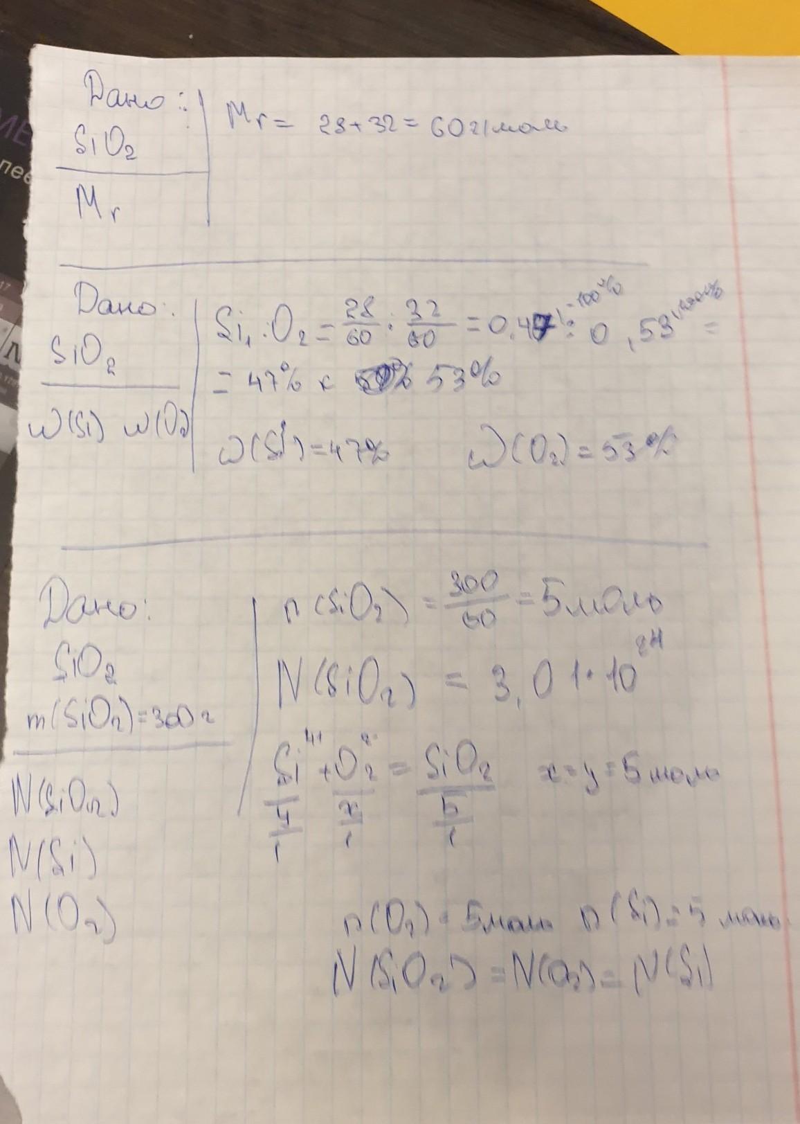 г) число молекул и число атомов кремния и кислорода в 300 г белого песка: