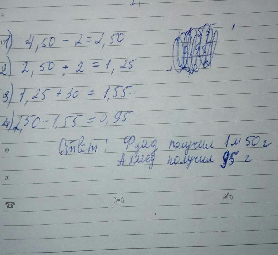 Лейла Ахмед и Фуад поделили между собой 4 манат 50 гяпик. Лейла получила 2 манат а Фуада досталось 30 гяпик больше чем Ахмед. Сколько им досталось