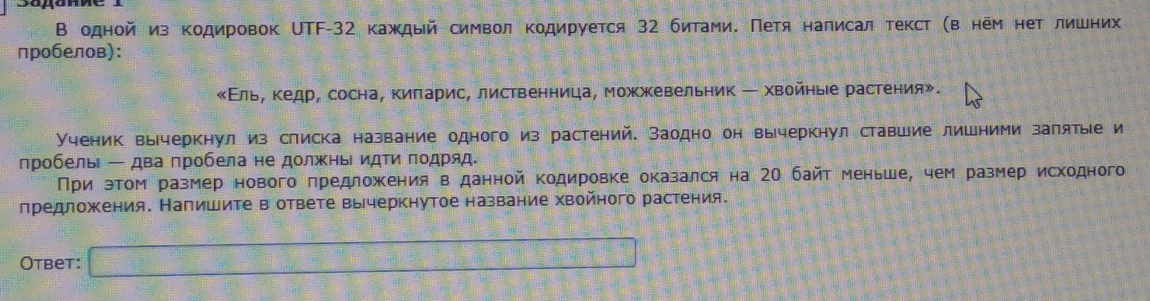 Поскольку один символ кодируется двумя байтами, из текста удалили 13 символов.запятая и пробел занимают четыре байта. Название растения, которое удалили из списка, должно состоять из 11 букв, поскольку (26 − 4) : 2 = 11 символов. Из всего списка только одно название растения состоит из 11 букв — лиственница.