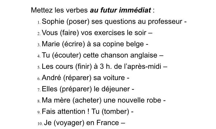 1. va poser 2. allez faire 3. va écrire 4. vas écouter 5. vont finir 6. va réparer 7. vont préparer 8. va acheter 9. vas tomber 10. vais voyager