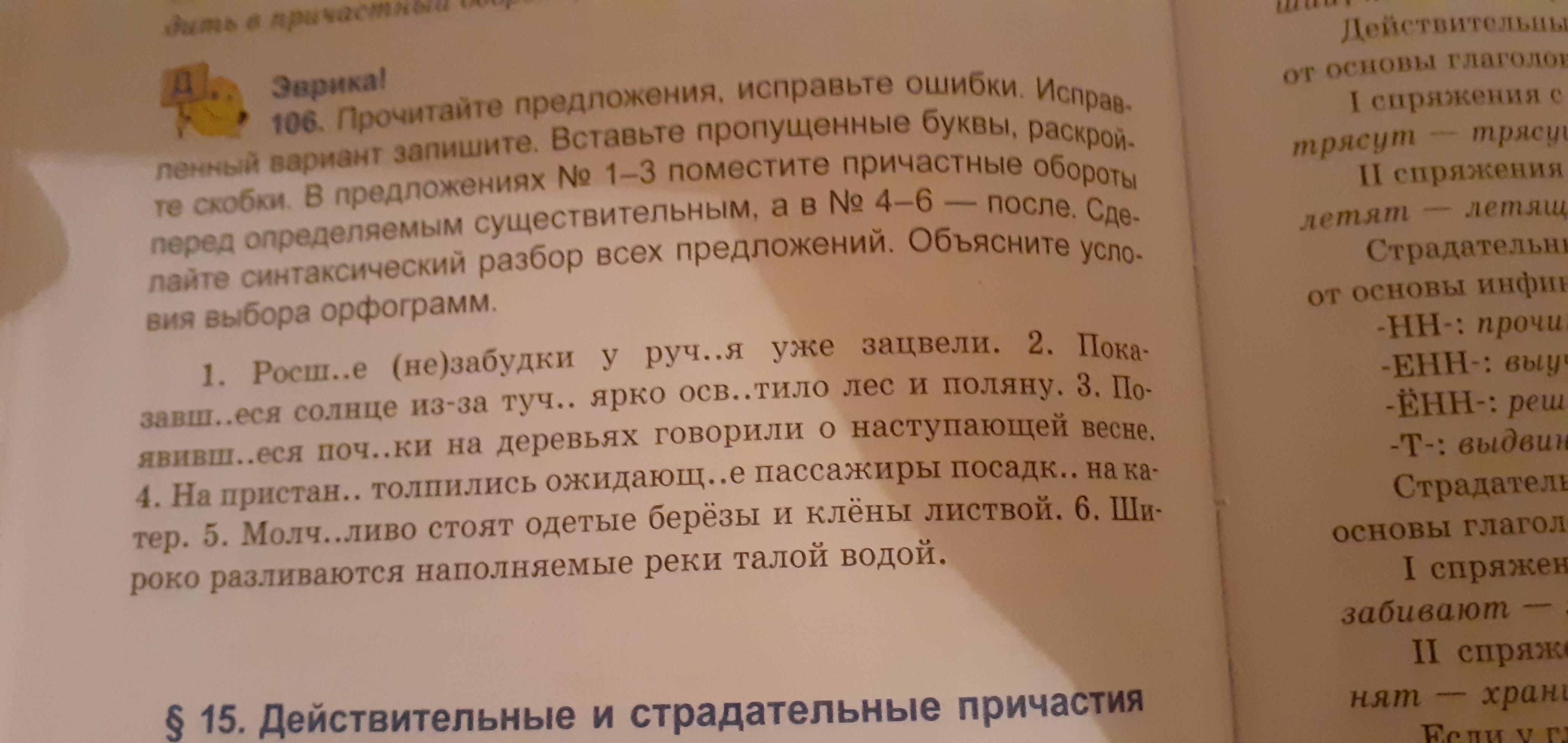 1. Росшие у ручья незабудки уже зацвели 2. Показавшееся из-за туч солнце ярко осветило лес и поляну. 3. Появившееся на деревьях почки говорили о наступающей весне. 4. На пристани толпились пассажиры, ожидающие посадки на катер 5. Молчаливо стоят березы и клены, одетые листвой 6. Широко разливаются реки, наполняемые талой водой.