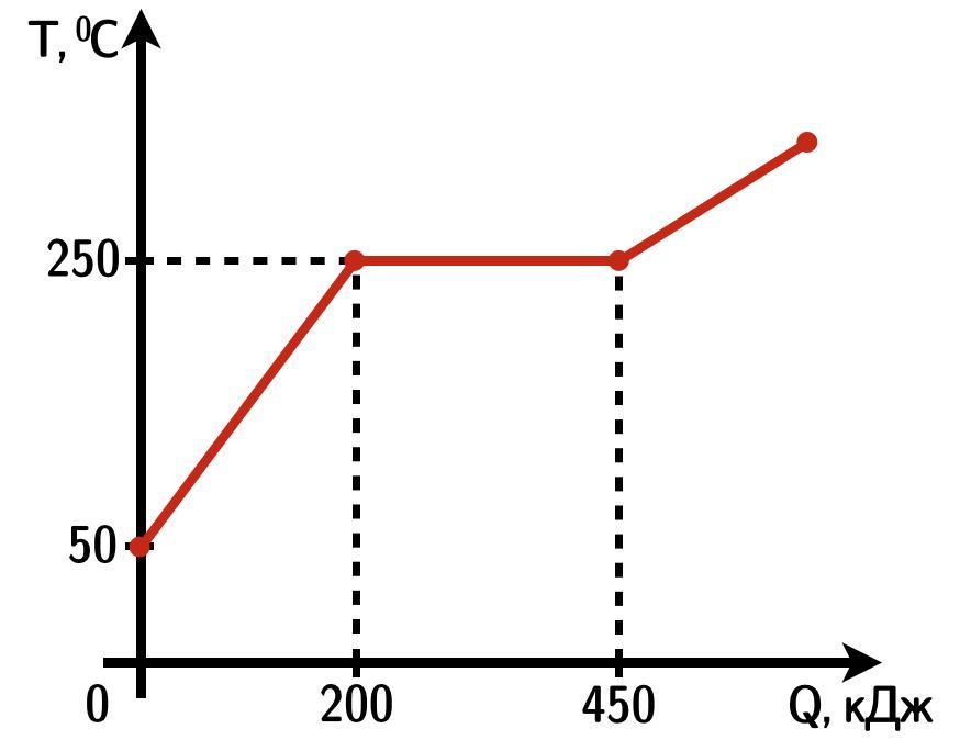 Плавлению соответствует горизонтальный участок графика, он ограничен по оси Х отметками 450 кДж и 200 кДж, следовательно на плавление затрачено Q=450-200=250 кДж. Удельная теплота плавления λ=Q/m=250/5=50 кДж/кг